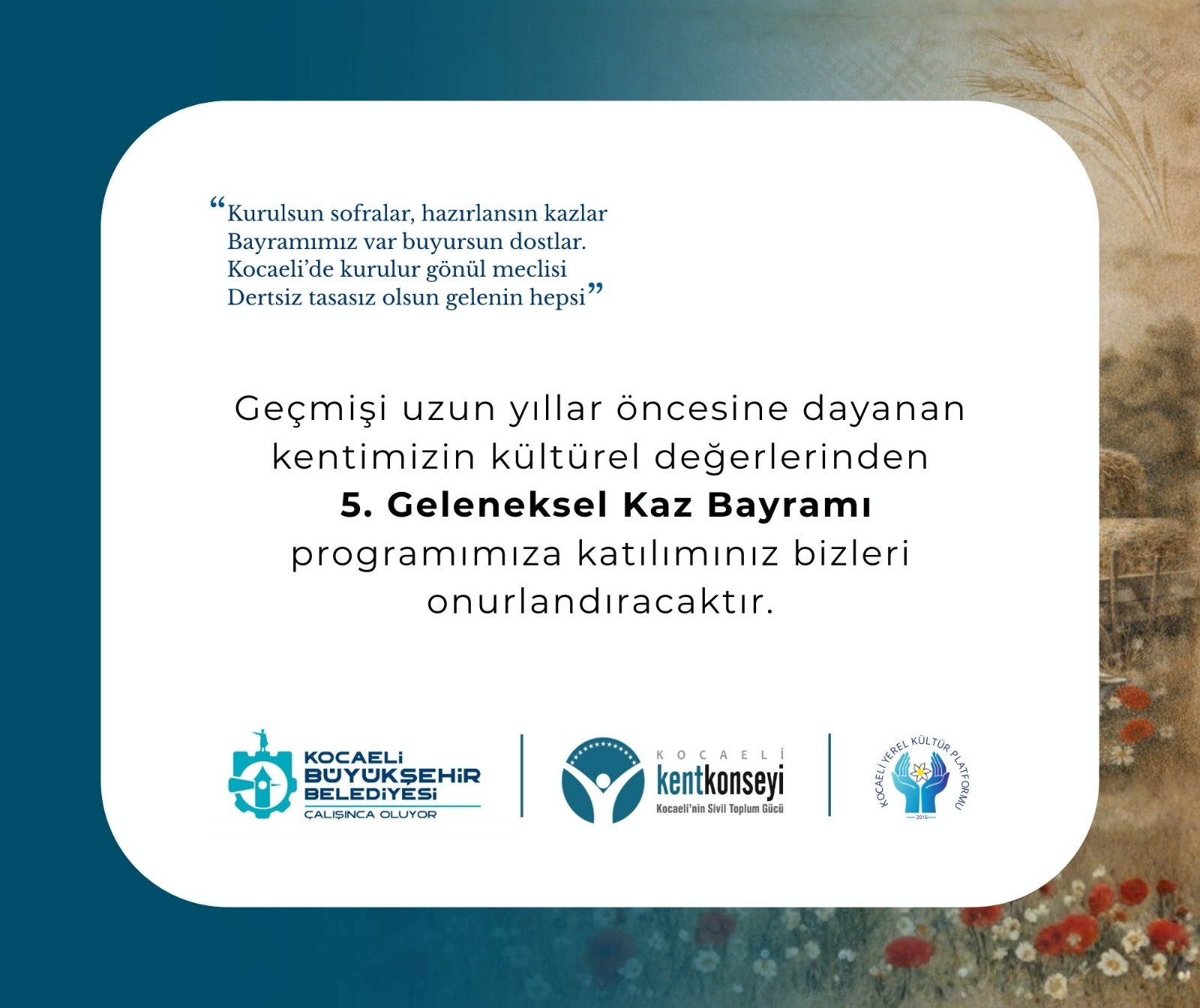 Kocaeli Kent Konseyi tarafından yapılan davette, Kaz Bayramı’nın kentin kültürel mirası açısından taşıdığı öneme dikkat çekilirken, programa katılımın kendileri için memnuniyet verici olacağı ifade edildi.