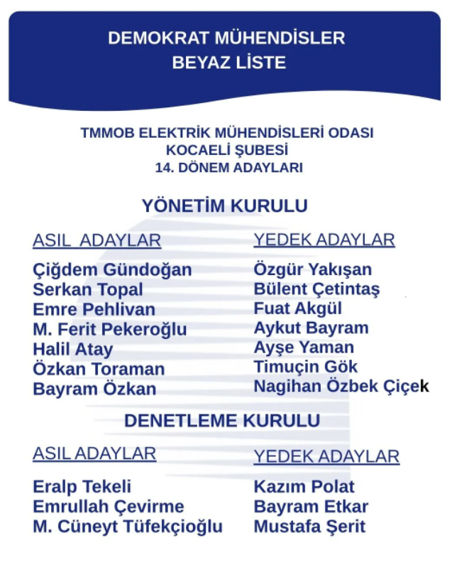 Demokrat Mühendisler Beyaz Liste, Kocaeli Elektrik Mühendisleri Odası’nın 14. dönem yönetimi için adaylığını daha önce kamuoyuna açıklarken, genel kurul öncesi yürütülen çalışmalar, çoğulculuk, katılımcılık ve meslek örgütü kültürü vurgusuyla sürdürülüyor.