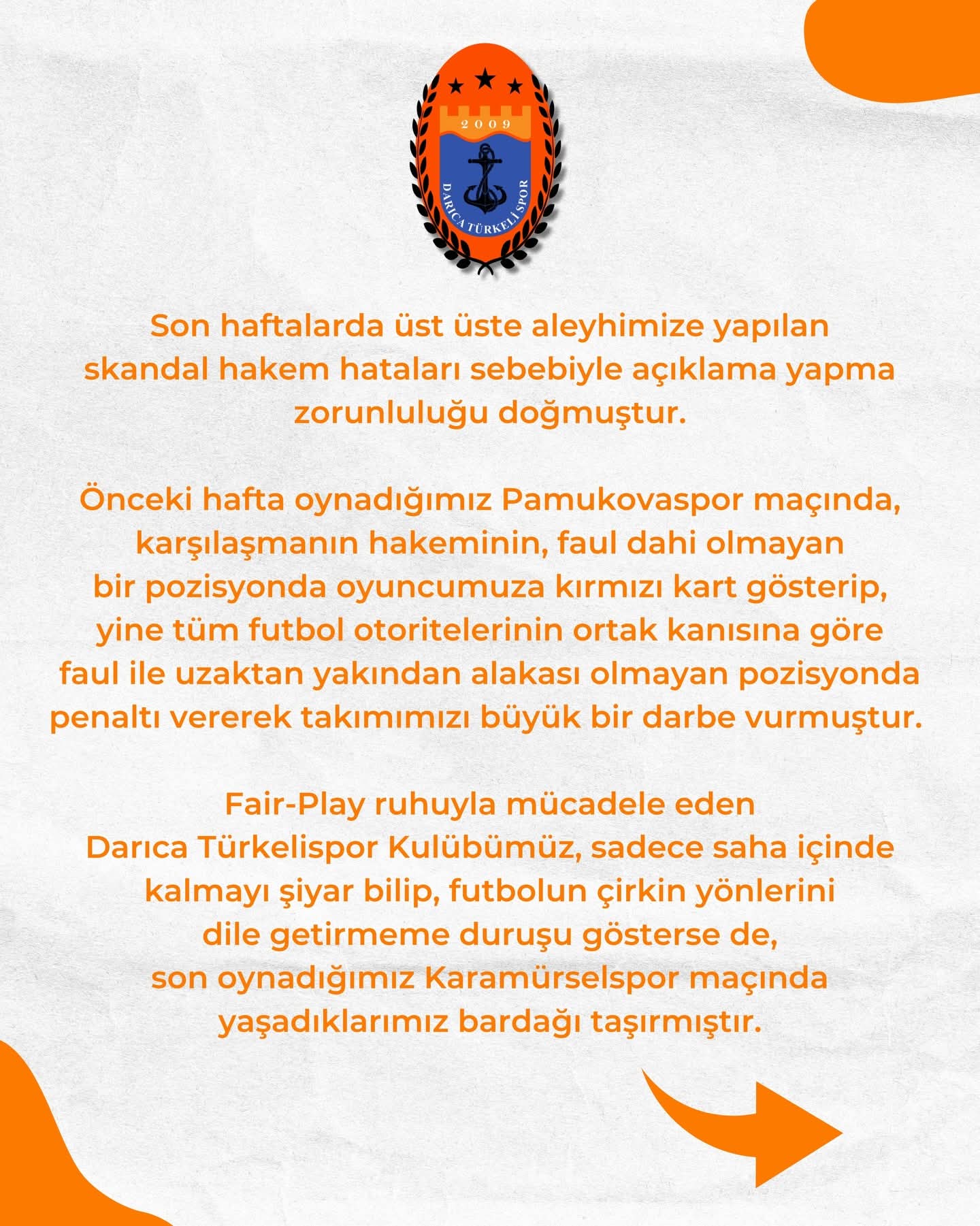Kulüp tarafından yayımlanan kamuoyu açıklamasında, özellikle son iki haftada yaşanan kritik pozisyonlara dikkat çekildi. Pamukovaspor maçındaki tartışmalı kırmızı kart ve penaltı kararlarının ardından, son oynanan Karamürselspor maçındaki yönetim "bardağı taşıran son damla" olarak nitelendirildi.