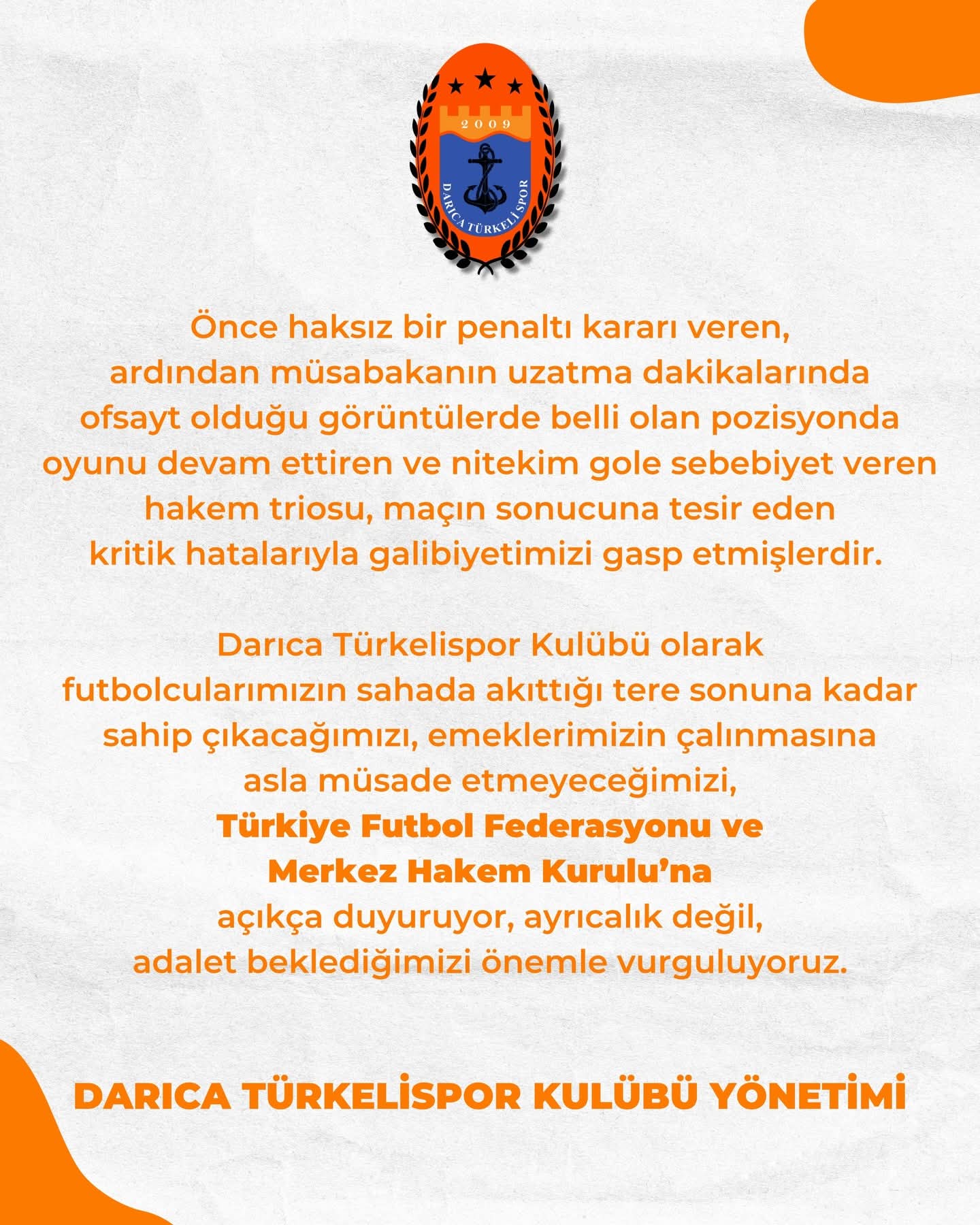 "Önce haksız bir penaltı kararı veren, ardından uzatma dakikalarında net ofsayt olan pozisyonda oyunu devam ettirerek gole sebebiyet veren hakem triosu, galibiyetimizi gasp etmiştir."