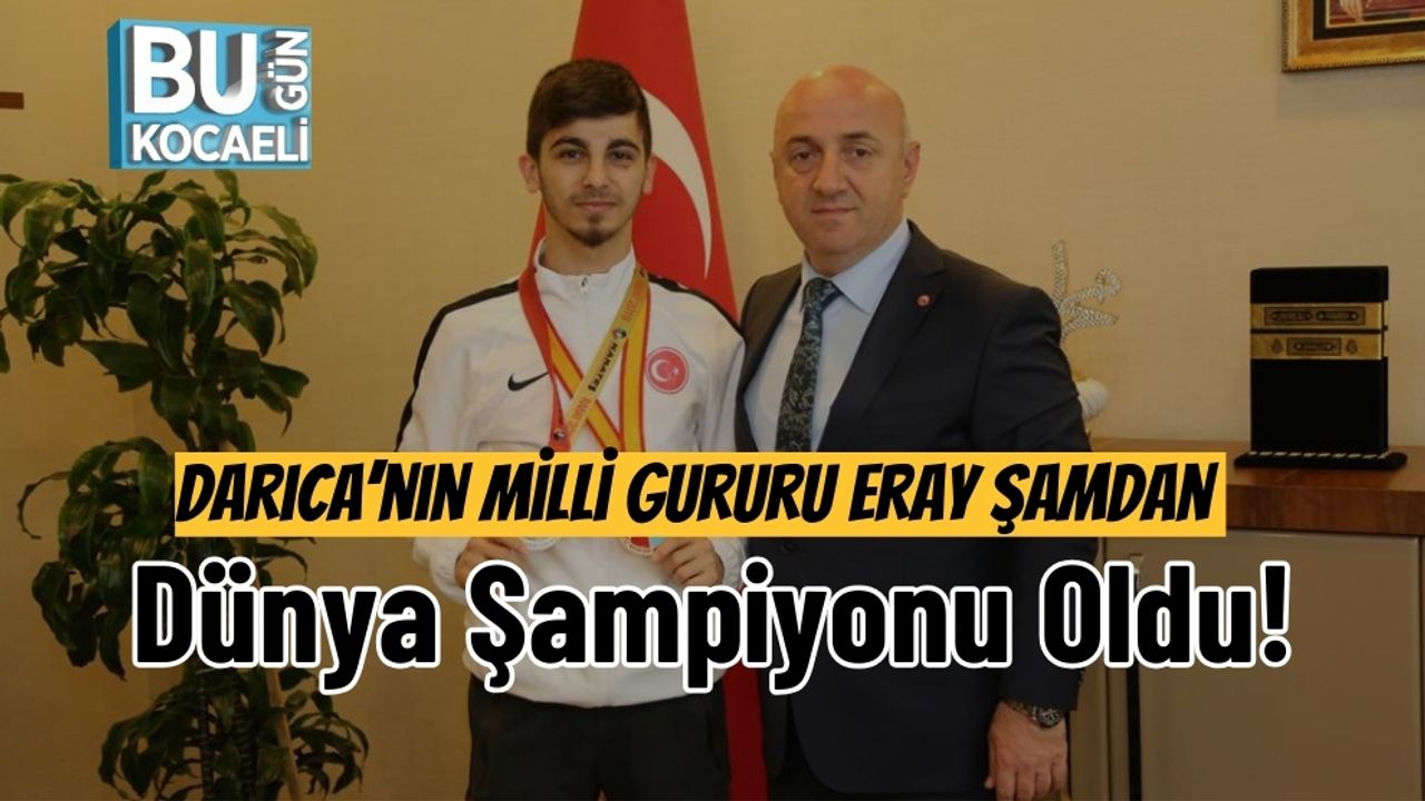 Darıca Belediyesi Eğitim Spor Kulübü’nün milli yıldızı Eray Şamdan, Mısır’ın Kahire şehrinde düzenlenen 27. Büyükler Dünya Karate Şampiyonası’nda altın madalya kazanarak dünya şampiyonu oldu. Darıca Belediye Başkanı Muzaffer Bıyık, tarihi şampiyonluk sonrası Şamdan’ı tebrik ederek “Darıca olarak bir kez daha gurur duyuyoruz” dedi.
