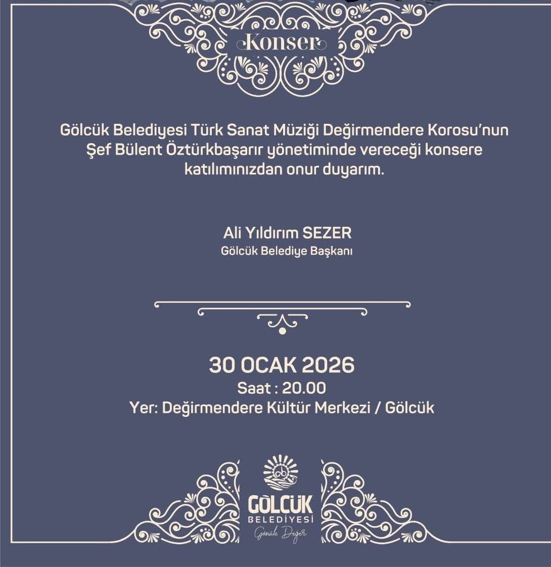 Gölcük Belediyesi Değirmendere Türk Sanat Müziği Korosu, Şef Bülent Öztürk Başarır yönetiminde 30 Ocak 2026 Cuma akşamı Değirmendere Kültür Merkezi’nde müzikseverlerle bir araya gelecek. Saat 20.00’de başlayacak konser, Türk Sanat Müziği’nin zarif üslubunu ve köklü makam geleneğini sahneye taşıyacak.
