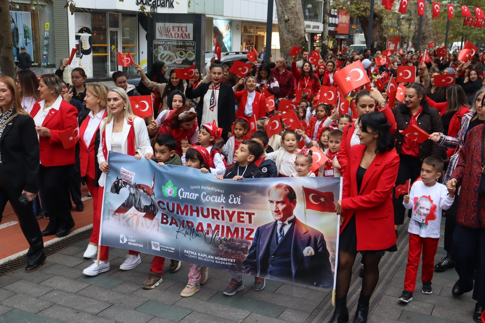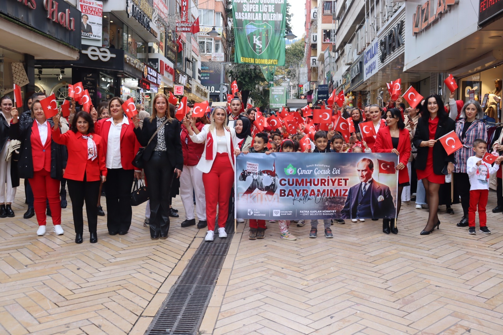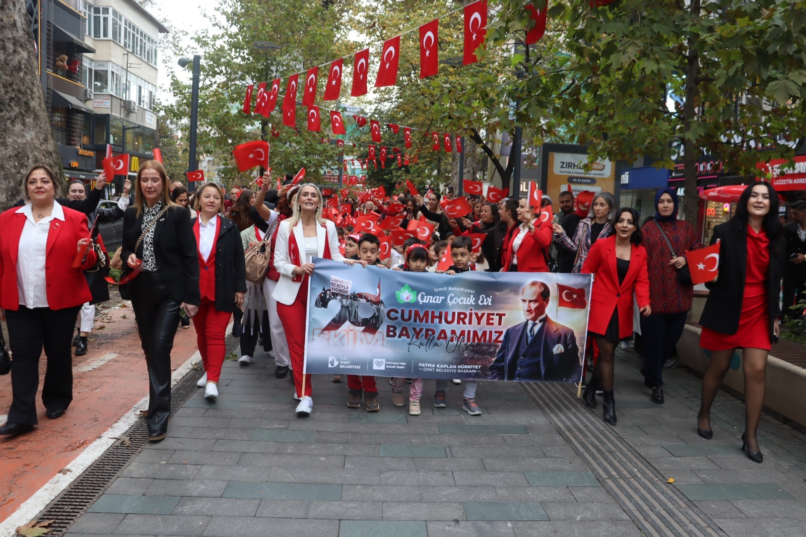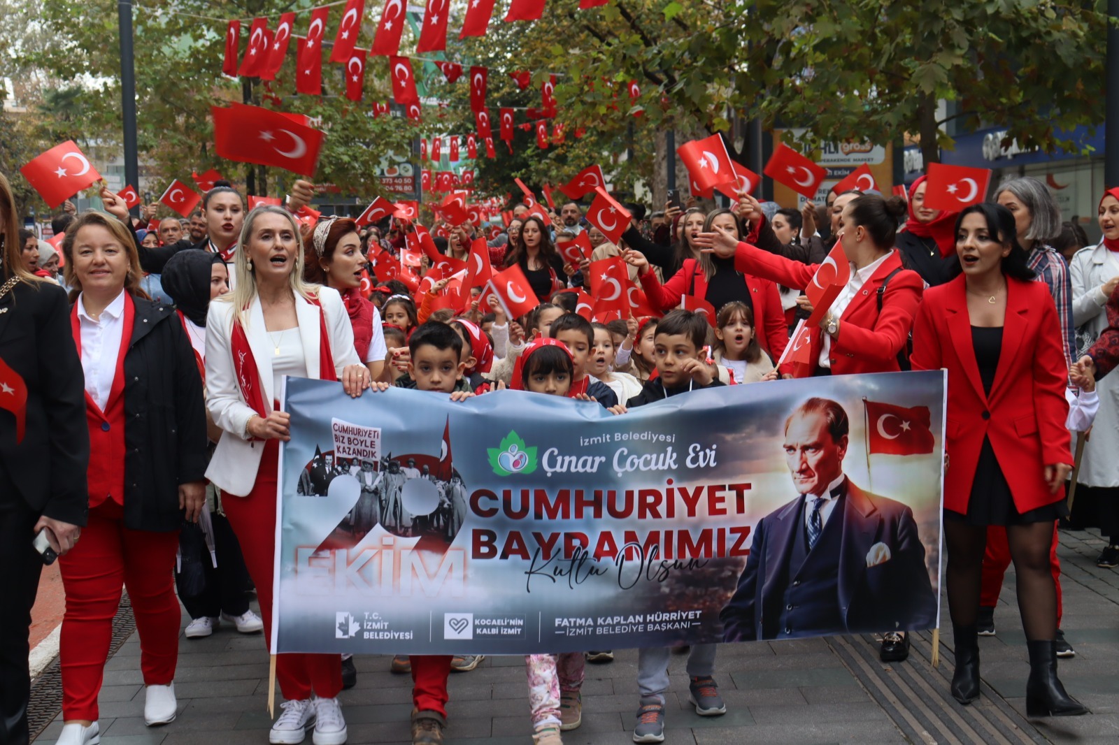 İzmit Belediyesi Çınar Çocuk Evleri, 29 Ekim Cumhuriyet Bayramı’nı anlamlı ve renkli bir etkinlikle kutladı. Fethiye Caddesi’nde başlayan Cumhuriyet Korteji, miniklerin ellerinde taşıdığı Türk bayrakları ve söyledikleri marşlarla adeta bayram havası estirdi. Kırmızı beyaza bürünen cadde boyunca vatandaşlar alkışlarla korteje eşlik etti. Çocukların taşıdığı coşku, kalabalığın da yüzünde tebessüme dönüştü. Her adımda Cumhuriyet’in değerlerini yansıtan yürüyüş, hem duygusal hem de umut doluydu.