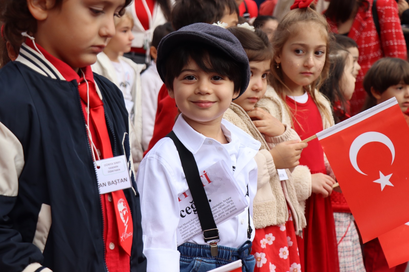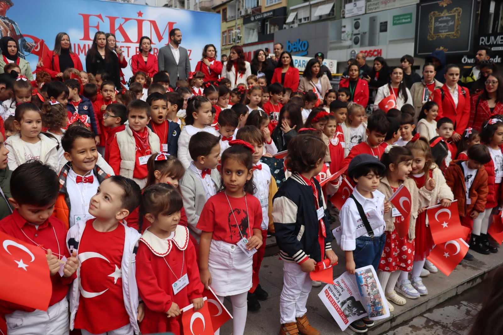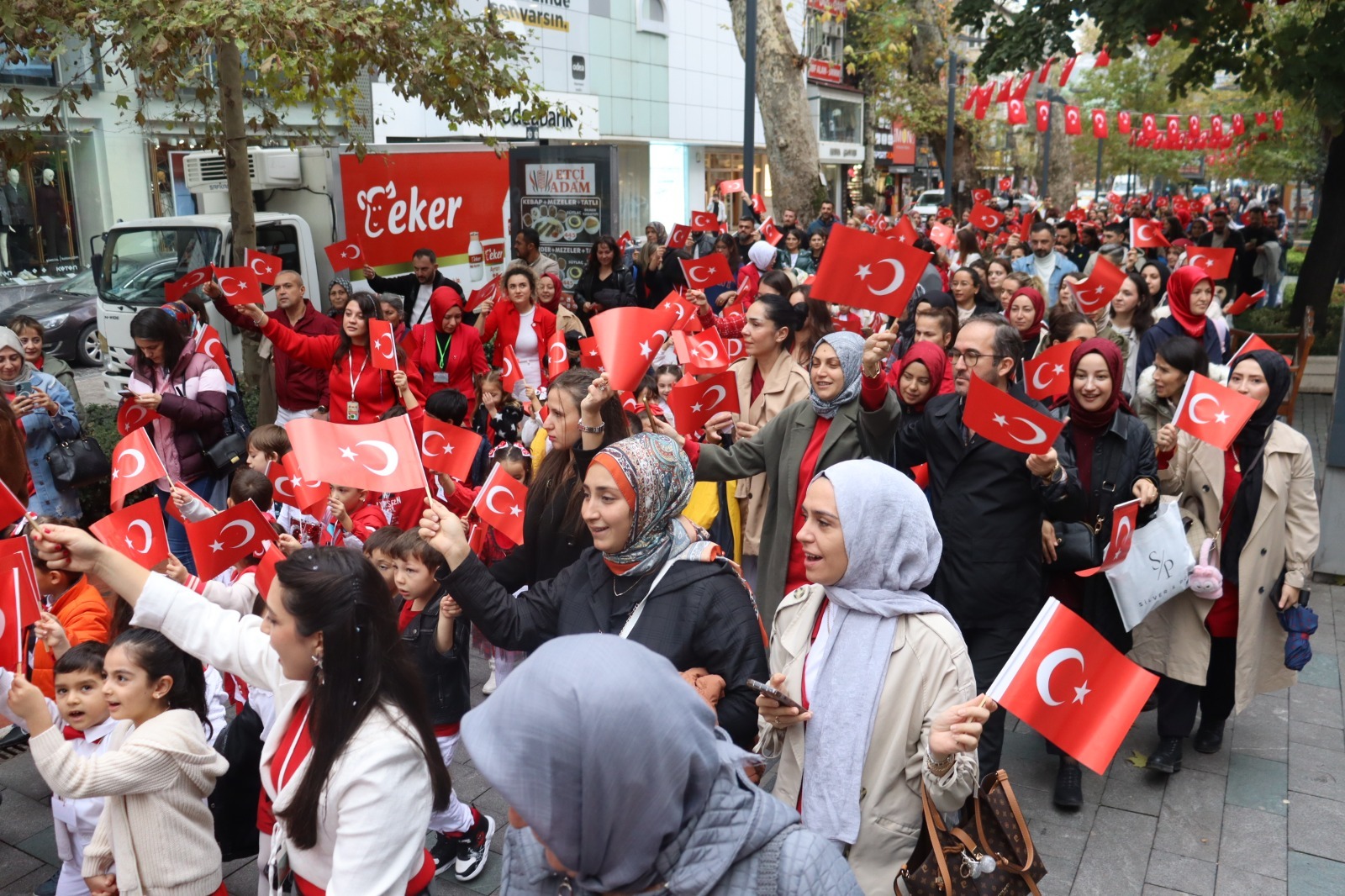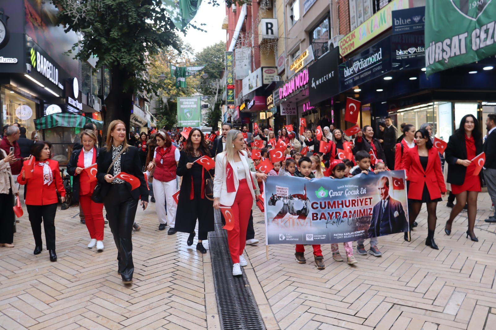 İzmit Belediyesi Çınar Çocuk Evleri, 29 Ekim Cumhuriyet Bayramı’nı anlamlı ve renkli bir etkinlikle kutladı. Fethiye Caddesi’nde başlayan Cumhuriyet Korteji, miniklerin ellerinde taşıdığı Türk bayrakları ve söyledikleri marşlarla adeta bayram havası estirdi. Kırmızı beyaza bürünen cadde boyunca vatandaşlar alkışlarla korteje eşlik etti. Çocukların taşıdığı coşku, kalabalığın da yüzünde tebessüme dönüştü. Her adımda Cumhuriyet’in değerlerini yansıtan yürüyüş, hem duygusal hem de umut doluydu.