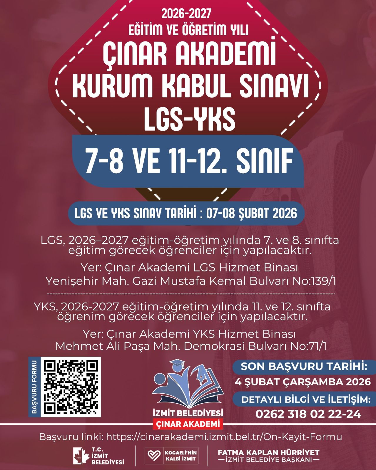 İzmit Belediyesi bünyesinde faaliyet gösteren Çınar Akademi, nitelikli ve erişilebilir eğitim anlayışıyla her yıl yüzlerce öğrenciye destek sunuyor. Akademi, yeni eğitim öğretim yılı öncesinde düzenleyeceği Kurum Kabul Sınavı ile öğrencilerin akademik düzeylerini ölçmeyi ve bu doğrultuda kapsamlı bir eğitim planlaması yapmayı hedefliyor. 2026-2027 dönemi için kapılarını açmaya hazırlanan Çınar Akademi, özellikle sınav gruplarındaki öğrenciler için güçlü bir hazırlık süreci sunmayı amaçlıyor. Yapılacak sınav, öğrencilerin mevcut durumlarını ortaya koyarken aynı zamanda bireysel gelişim alanlarının da belirlenmesine imkân sağlayacak.