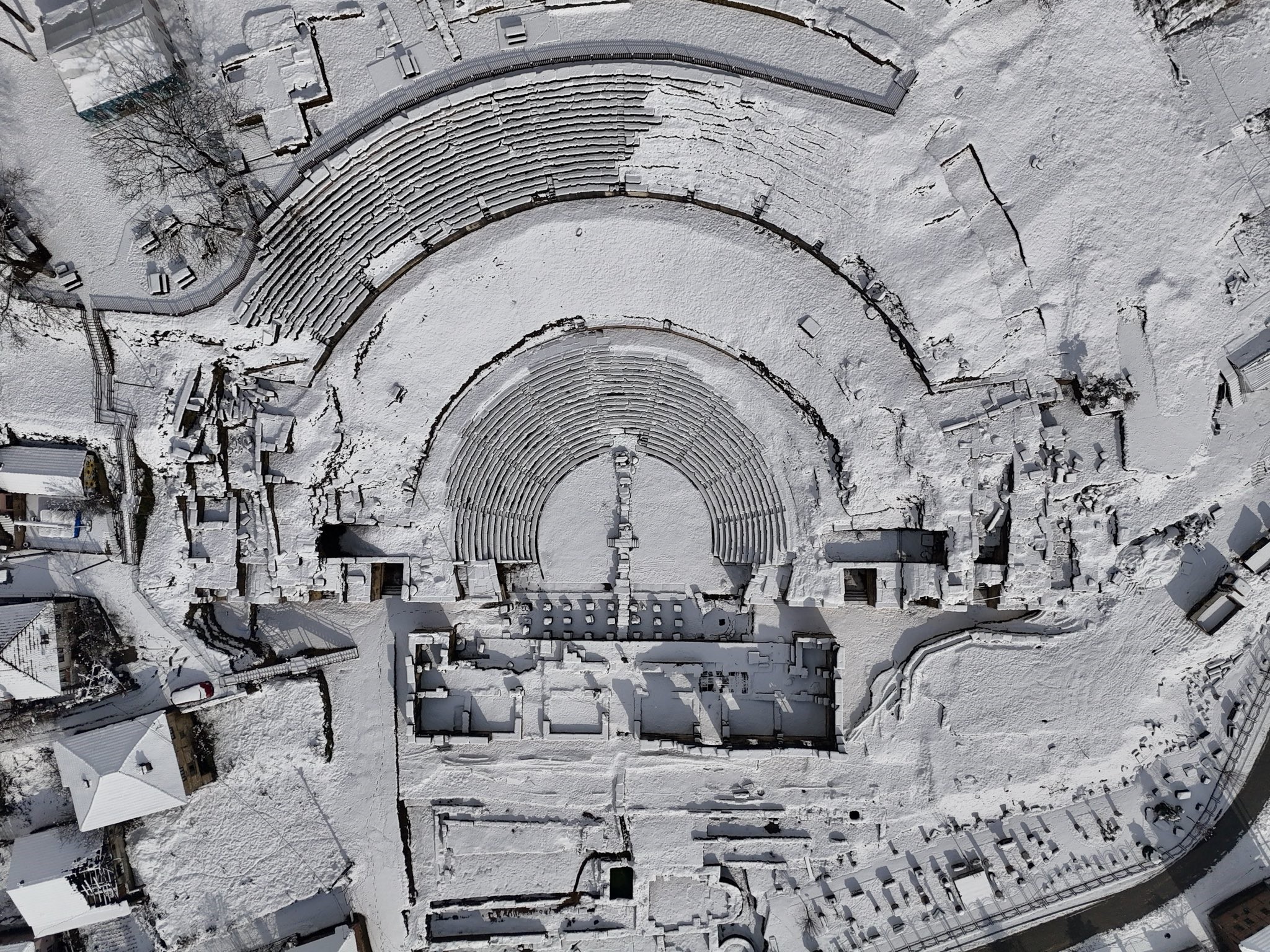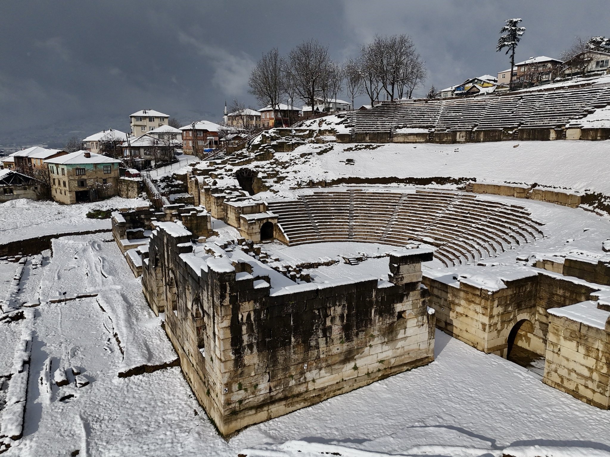 Kar yağışıyla birlikte Düzce'nin tarihi simgelerinden biri olan Prusias Ad Hypium Antik Kenti, beyaz örtüyle adeta yeniden hayat buldu. Antik tiyatronun basamakları, sütunlar ve taş duvarlar karla kaplanırken ortaya çıkan manzara, görenleri geçmişe doğru bir yolculuğa çıkardı. Özellikle sabah saatlerinde oluşan sessizlik ve ışıkla birleşen bu görüntüler, ziyaretçilerden tam not aldı.