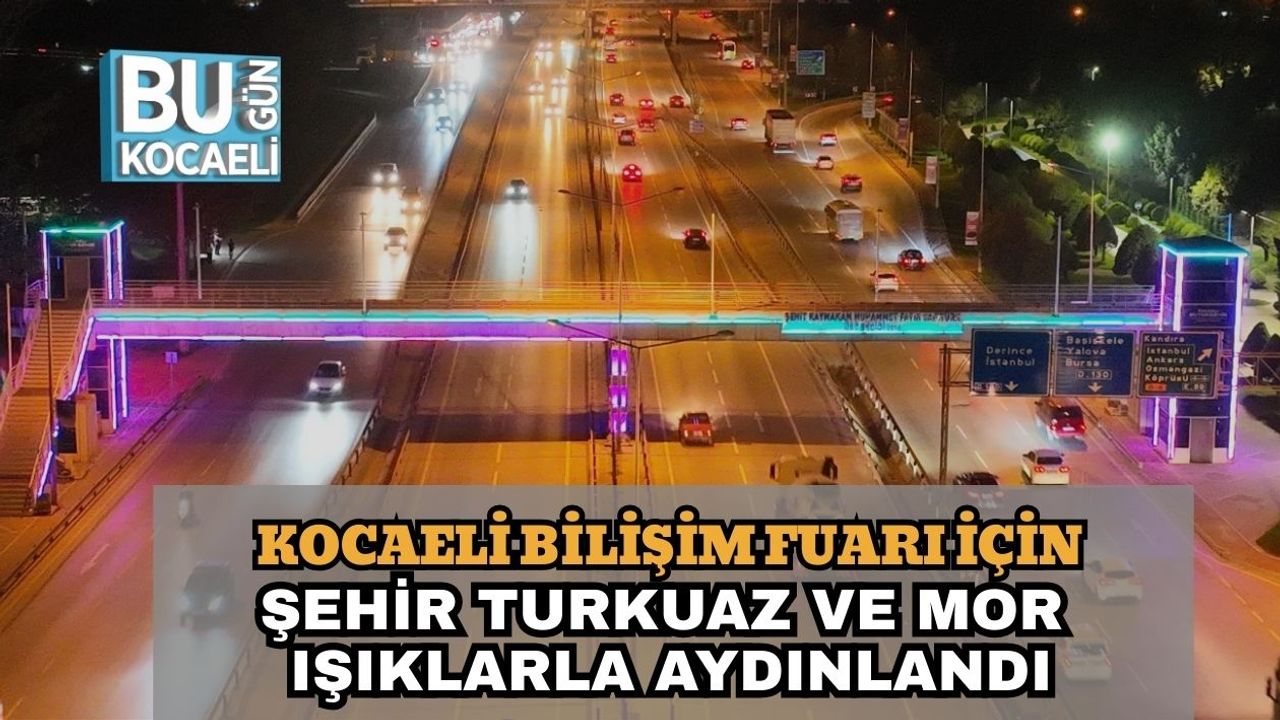 Kocaeli Büyükşehir Belediyesi’nin ev sahipliğinde düzenlenen Kocaeli Bilişim Fuarı, daha başlamadan kent genelinde oluşturulan renkli atmosferle dikkat çekti. Büyükşehir ekipleri, köprü ve üst geçitleri fuarın renkleri olan turkuaz ve mor ışıklarla aydınlatarak şehirde görsel bir şölen sundu.