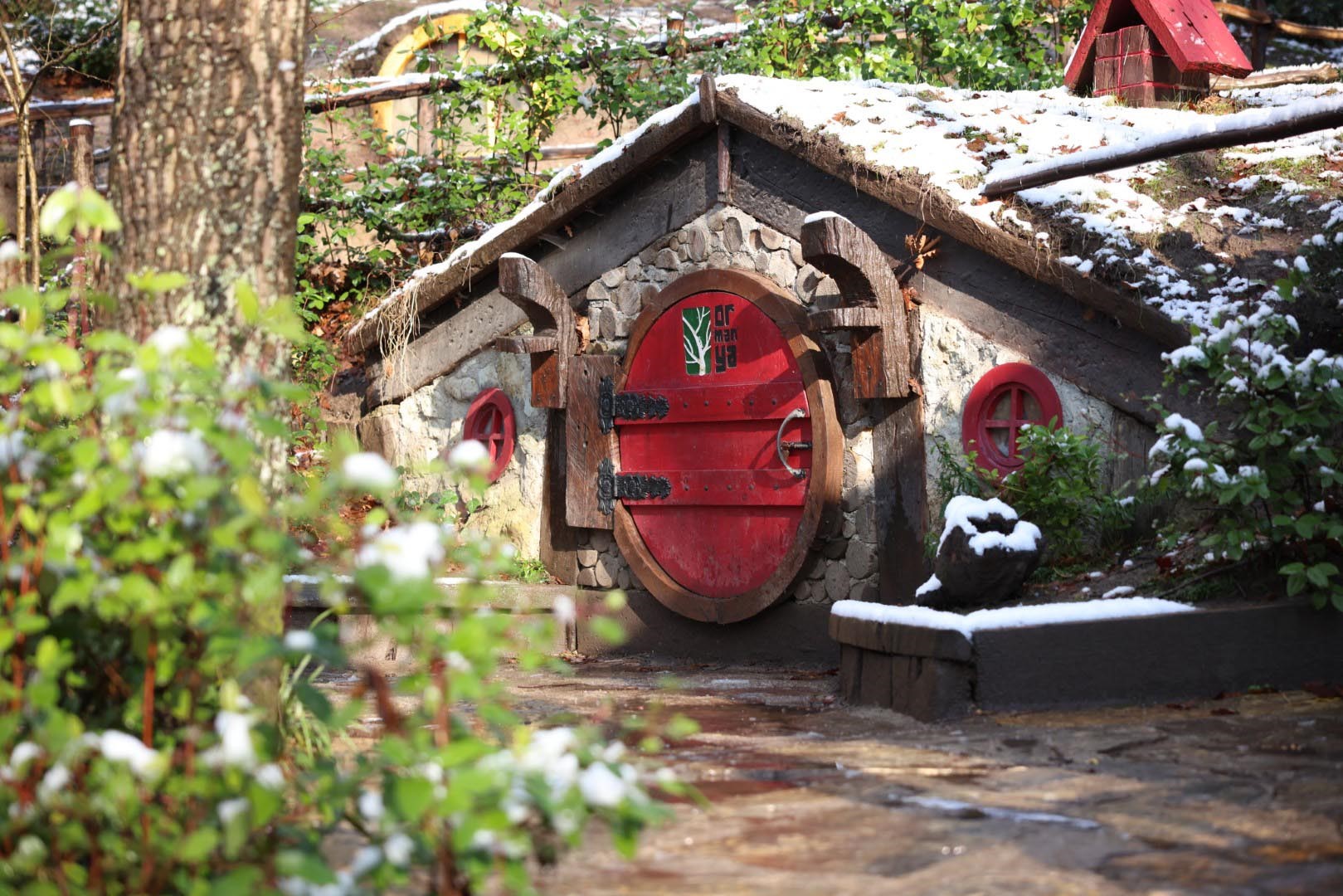 Ormanya’nın ilgi çeken bölümlerinden biri olan Ormanköy, kar yağışıyla birlikte kartpostallık görüntülere sahne oldu. Yüzüklerin Efendisi filmindeki Hobbit evlerini andıran yapılar, beyaz kar örtüsüyle bütünleşince ziyaretçilerin ilgisini daha da çekti.