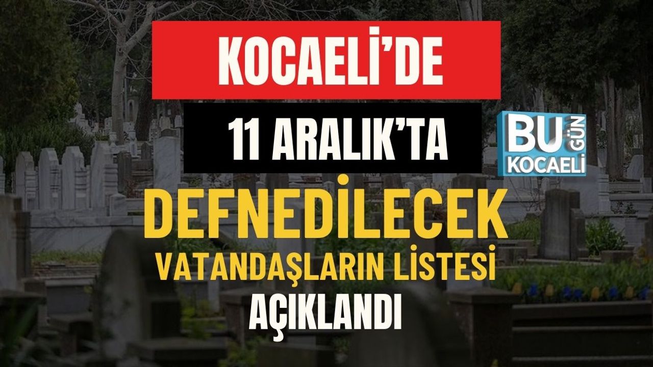 Kocaeli Büyükşehir Belediyesi Mezarlıklar Müdürlüğü, 10–11 Aralık tarihlerinde yaşamını yitiren vatandaşların cenaze programlarını açıkladı. Doğal ölüm sebebiyle hayatını kaybeden 10 kişi için bugün öğle vaktinde çeşitli camilerde cenaze törenleri düzenlenecek. Defin işlemleri aynı gün içerisinde yapılacak.