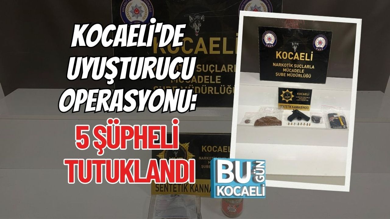 Kocaeli İl Emniyet Müdürlüğü'ne bağlı Narkotik Suçlarla Mücadele Şube Müdürlüğü ekipleri, uyuşturucuyla mücadele kapsamında il genelinde eş zamanlı operasyonlar gerçekleştirdi. Yapılan çalışmalarda 9 şüpheli şahıs gözaltına alınırken, çok sayıda uyuşturucu madde ve silah ele geçirildi. Gözaltına alınan şüphelilerden 4'ü adli işlemlerin ardından serbest bırakılırken, uyuşturucu madde ticareti yaptığı değerlendirilen 5 kişi tutuklanarak cezaevine gönderildi.