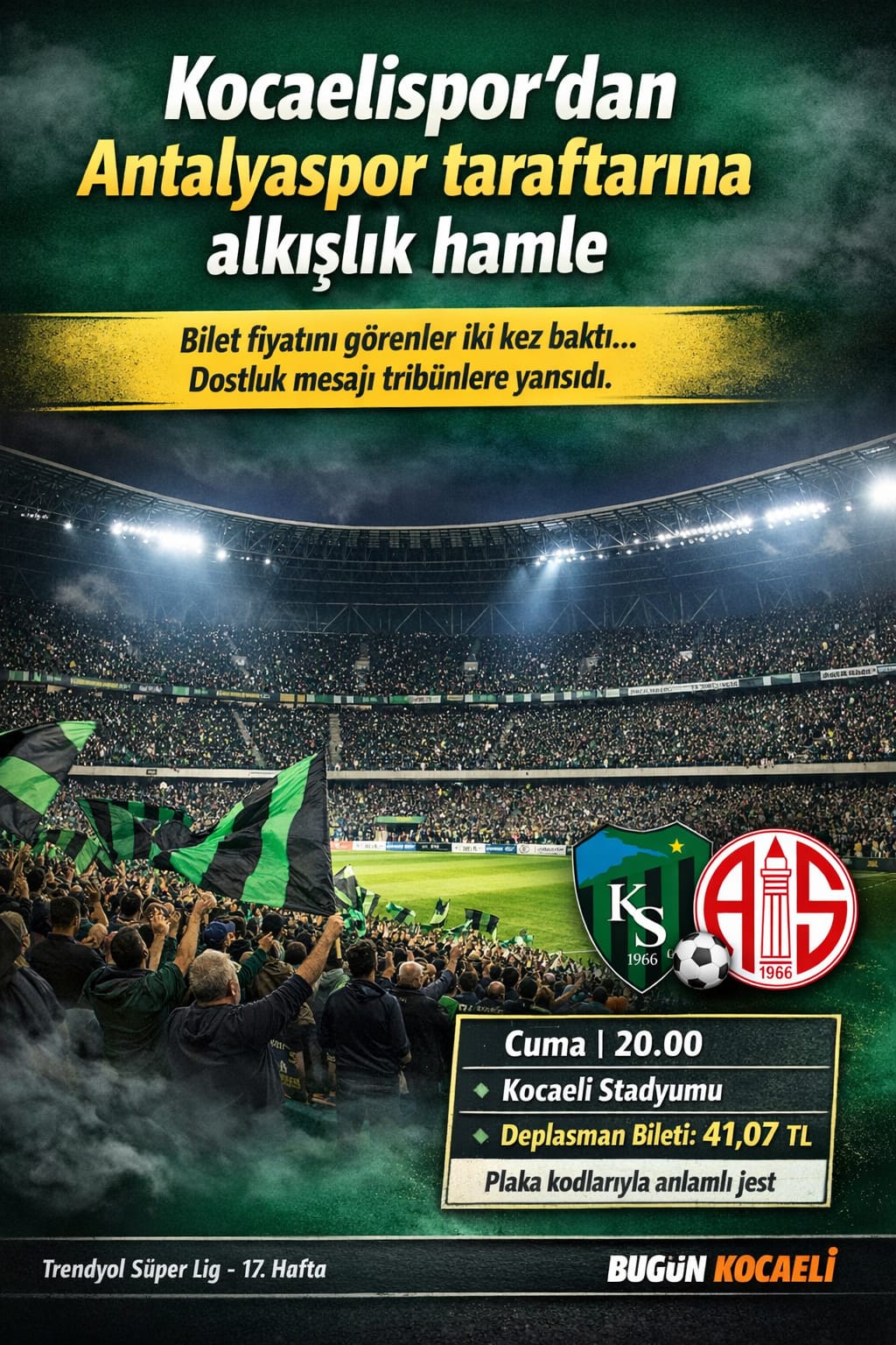 Trendyol Süper Lig’in 17. haftasında sahasında Antalyaspor’u konuk edecek olan Kocaelispor, sezonun ilk yarısındaki son iç saha maçı öncesi dikkat çeken bir adım attı. Cuma akşamı oynanacak karşılaşmanın biletleri satışa çıkarken, deplasman tribünü için belirlenen fiyat futbol kamuoyunda takdir topladı.