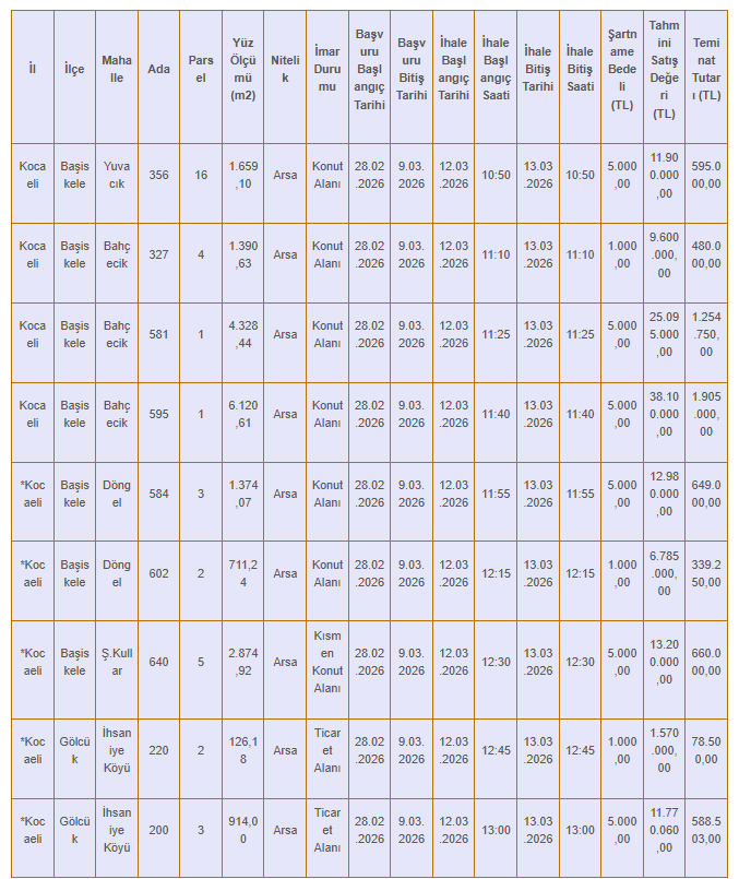 İhaleye konu olan arsalar Kocaeli’nin iki önemli ilçesi olan Başiskele ve Gölcük sınırları içerisinde yer alıyor. Taşınmazların büyük bölümü konut imarlı olup, yatırım açısından yüksek potansiyele sahip bölgelerde bulunuyor.
